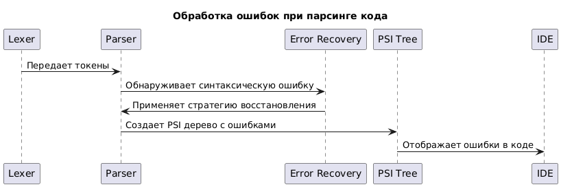 [\@startuml\ title Обработка ошибок при парсинге кода\ \ participant \"Lexer\" as Lexer\ participant \"Parser\" as Parser\ participant \"Error Recovery\" as ErrorRecovery\ participant \"PSI Tree\" as PSITree\ \ Lexer -\> Parser : Передает токены\ Parser -\> ErrorRecovery : Обнаруживает синтаксическую ошибку\ ErrorRecovery -\> Parser : Применяет стратегию восстановления\ Parser -\> PSITree : Создает PSI дерево с ошибками\ PSITree -\> IDE : Отображает ошибки в коде\ \ \@enduml]{.mark}