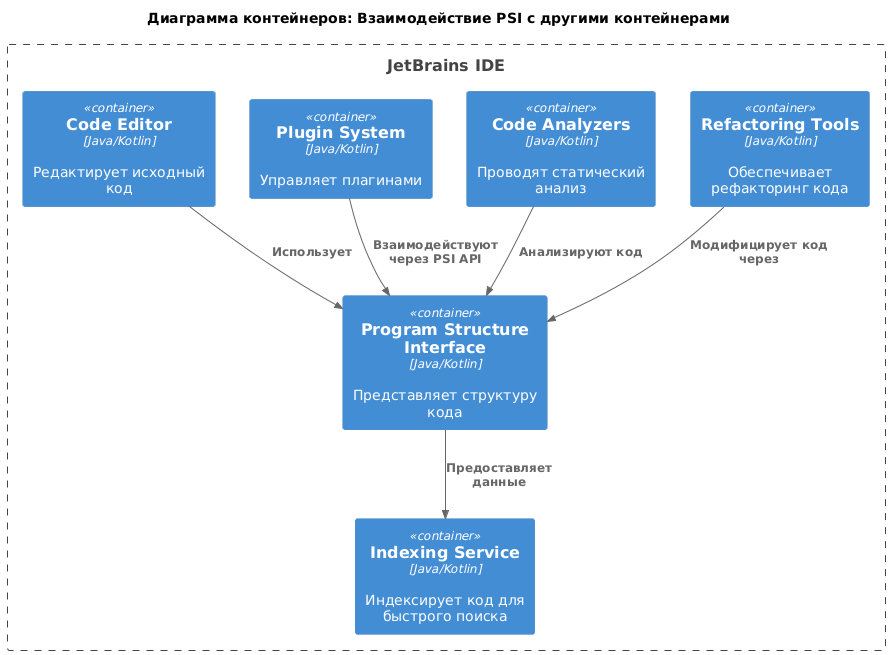 [\@startuml\ \' Подключаем библиотеку для диаграммы контейнеров\ !include https://raw.githubusercontent.com/plantuml-stdlib/C4-PlantUML/master/C4_Container.puml\ \ title Диаграмма контейнеров: Взаимодействие PSI с другими контейнерами\ \ Boundary(IDE, \"JetBrains IDE\") {\ Container(Editor, \"Code Editor\", \"Java/Kotlin\", \"Редактирует исходный код\")\ Container(PSI, \"Program Structure Interface\", \"Java/Kotlin\", \"Представляет структуру кода\")\ Container(Indexing, \"Indexing Service\", \"Java/Kotlin\", \"Индексирует код для быстрого поиска\")\ Container(Plugins, \"Plugin System\", \"Java/Kotlin\", \"Управляет плагинами\")\ Container(Analyzers, \"Code Analyzers\", \"Java/Kotlin\", \"Проводят статический анализ\")\ Container(Refactoring, \"Refactoring Tools\", \"Java/Kotlin\", \"Обеспечивает рефакторинг кода\")\ }\ \ Rel(Editor, PSI, \"Использует\")\ Rel(PSI, Indexing, \"Предоставляет данные\")\ Rel(Plugins, PSI, \"Взаимодействуют через PSI API\")\ Rel(Analyzers, PSI, \"Анализируют код\")\ Rel(Refactoring, PSI, \"Модифицирует код через\")\ \ \@enduml]{.mark}