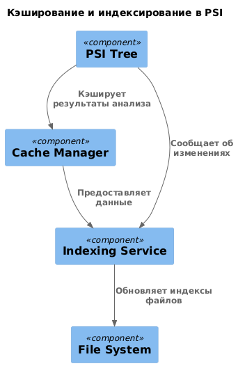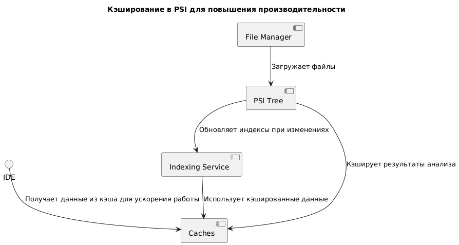 [\@startuml\ title Кэширование в PSI для повышения производительности\ \ component \"PSI Tree\" as PSITree\ component \"File Manager\" as FileManager\ component \"Indexing Service\" as Indexing\ component \"Caches\" as Caches\ \ FileManager \--\> PSITree : Загружает файлы\ PSITree \--\> Caches : Кэширует результаты анализа\ Indexing \--\> Caches : Использует кэшированные данные\ PSITree \--\> Indexing : Обновляет индексы при изменениях\ IDE \--\> Caches : Получает данные из кэша для ускорения работы\ \ \@enduml]{.mark}