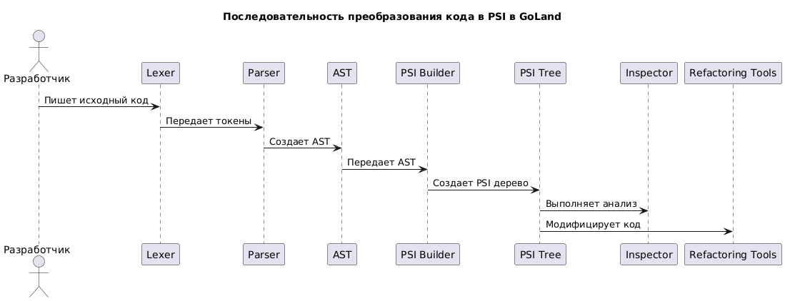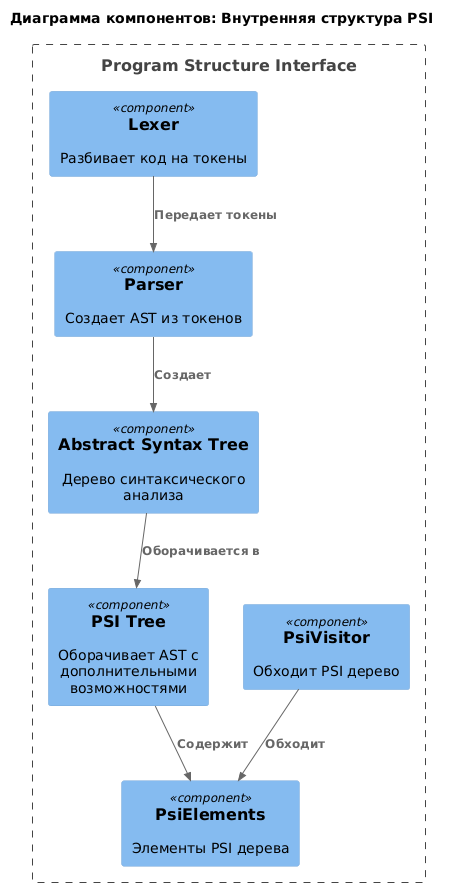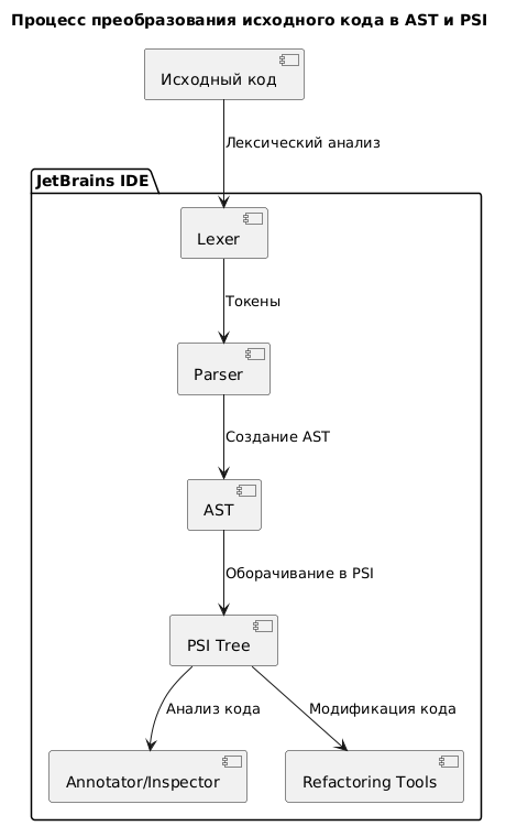 Цель диаграммы: Показать, как различные компоненты PSI взаимодействуют между собой при обработке исходного кода в IDE JetBrains.