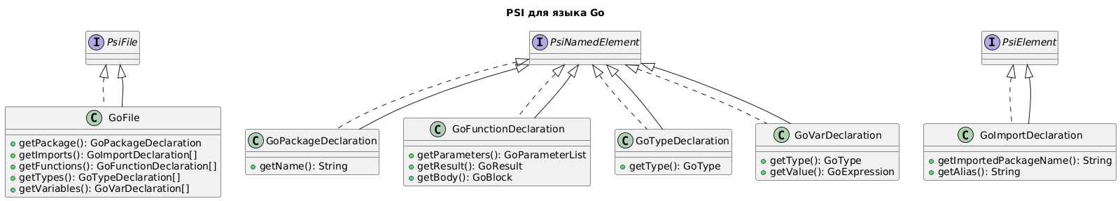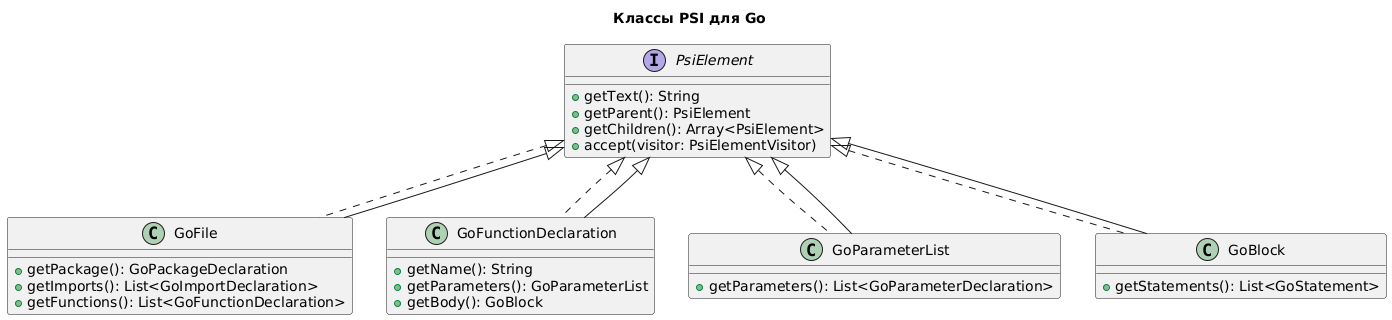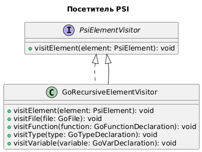 [\@startuml\ title Посетитель *PSI*\ \ interface *PsiElementVisitor* {\ +visitElement(element: *PsiElement*): void\ }\ \ class GoRecursiveElementVisitor implements PsiElementVisitor {\ +visitElement(element: *PsiElement*): void\ +visitFile(file: *GoFile*): void\ +visitFunction(function: *GoFunctionDeclaration*): void\ +visitType(type: *GoTypeDeclaration*): void\ +visitVariable(variable: *GoVarDeclaration*): void\ }\ \ *PsiElementVisitor* \<\|\-- *GoRecursiveElementVisitor*\ \ \@enduml]{.mark}