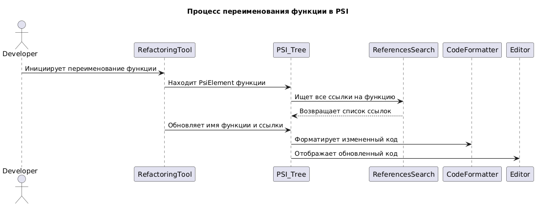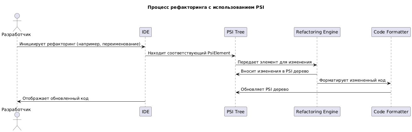 [\@startuml\ title Процесс рефакторинга с использованием PSI\ \ actor \"Разработчик\" as Dev\ participant \"IDE\" as IDE\ participant \"PSI Tree\" as PSITree\ participant \"Refactoring Engine\" as Refactoring\ participant \"Code Formatter\" as Formatter\ \ Dev -\> IDE : Инициирует рефакторинг (например, переименование)\ IDE -\> PSITree : Находит соответствующий PsiElement\ PSITree -\> Refactoring : Передает элемент для изменения\ Refactoring -\> PSITree : Вносит изменения в PSI дерево\ Refactoring -\> Formatter : Форматирует измененный код\ Formatter -\> PSITree : Обновляет PSI дерево\ IDE -\> Dev : Отображает обновленный код\ \ \@enduml]{.mark}