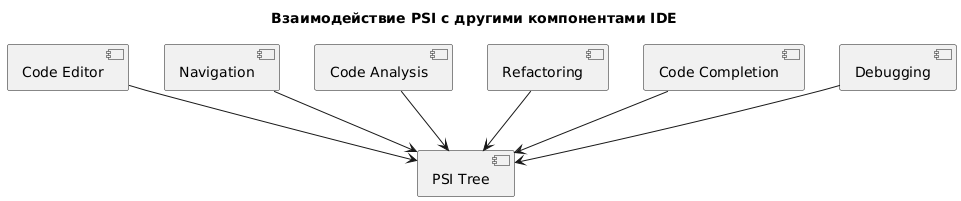 [\@startuml\ title Взаимодействие PSI с другими компонентами IDE\ \ component \"PSI Tree\" as PSITree\ component \"Code Editor\" as Editor\ component \"Navigation\" as Navigation\ component \"Code Analysis\" as Analysis\ component \"Refactoring\" as Refactoring\ component \"Code Completion\" as Completion\ component \"Debugging\" as Debugging\ \ Editor \--\> PSITree\ Navigation \--\> PSITree\ Analysis \--\> PSITree\ Refactoring \--\> PSITree\ Completion \--\> PSITree\ Debugging \--\> PSITree\ \ \@enduml]{.mark}